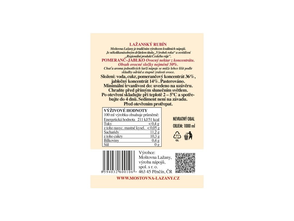 Je ovocný nektar vyroben z kvalitních koncentrátů, které se získaly šetrným zahuštěním ovocné šťávy, a proto jsou jeho chuťové vlastnosti obdobné jako u moštů. Před otevřrním doporučejeme protřepat - sediment není na závadu.